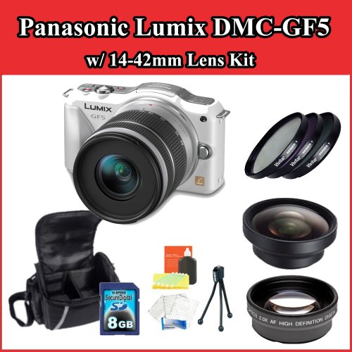 Panasonic Lumix DMC-GF1 12.1MP Micro Four-Thirds Interchangeable Lens Digital Camera with 14-45mm Lens Versatile Functions and Superb Images. Uncompromising Performance in the World's Smallest, Lightest System Camera* The GF1 adopts the Micro Four Thirds System standard, which was developed as an extended version of the Four Thirds System standard for digital camera systems. By using this standard and developing a camera body that eliminates the mirror box and optical viewfinder unit, LUMIX® was able to achieve a dramatic reduction in both size and weight compared with conventional digital SLR cameras, to create a new-generation system camera that features Full-time Live View, high-speed, high-precision Contrast AF, HD movie recording, and more. The GF1 is small enough to take anywhere yet sophisticated enough to take you as far into photography and movies as you want to go.12.1-Megapixel Live MOS Sensor: Higher Image Quality, Lower Power ConsumptionThe 4/3-type 12.1-megapixel Live MOS sensor featured in the GF1 offers the best of both worlds the superior image quality of a CCD sensor, and the lower power consumption of a CMOS sensor. This sensor is also advantageous for photo and movie recording with its high S/N, thanks to a new circuit structure that is unaffected by the noise generated in each of the circuits. It results in clear images even when taken at high ISO sensitivity.Ultra-Portable Pancake Lens: LUMIX G 20mm/F1.7 ASPH.This bright F1.7/20mm (35mm camera equivalent: 40mm) fixed focus lens makes it easier to take bright photos with soft focus in dimly lit conditions without a flash. Its compact, easy-to-carry size is also ideal for capturing everyday scenes and snapshots.